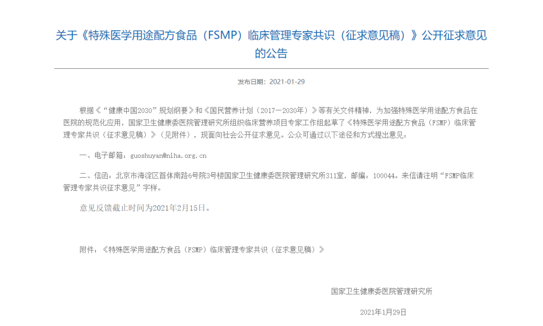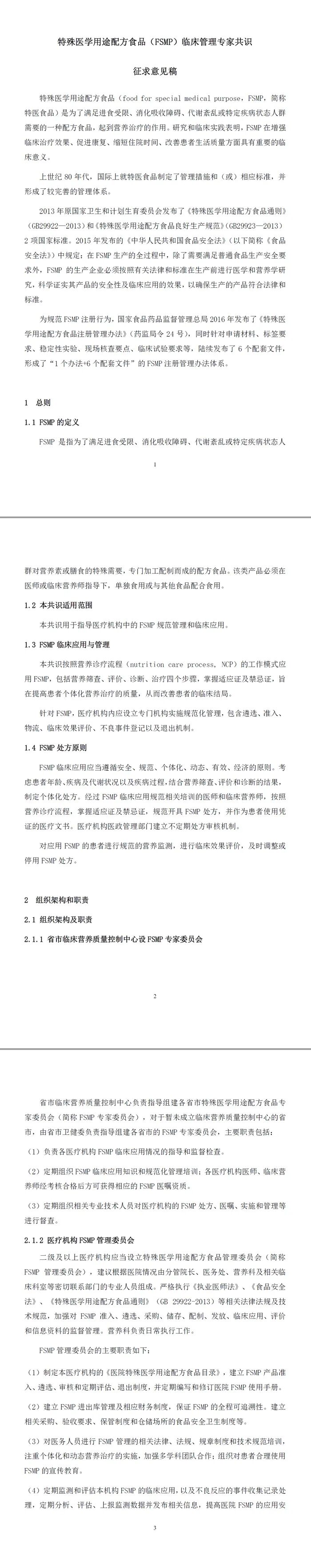根据《“健康中国2030”规划纲要》和《国民营养计划(2017—2030年)》等有关文件精神,为加强特殊医学用途配方食品在医院的规范化应用,国家卫生健康委医院管理研究所组织临床营养项目专家工作组起草了《特殊医学用途配方食品(FSMP)临床管理专家共识(征求意见稿)》(见附件)。